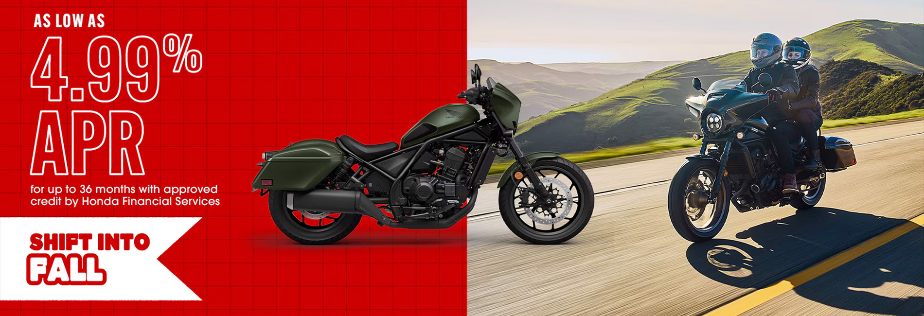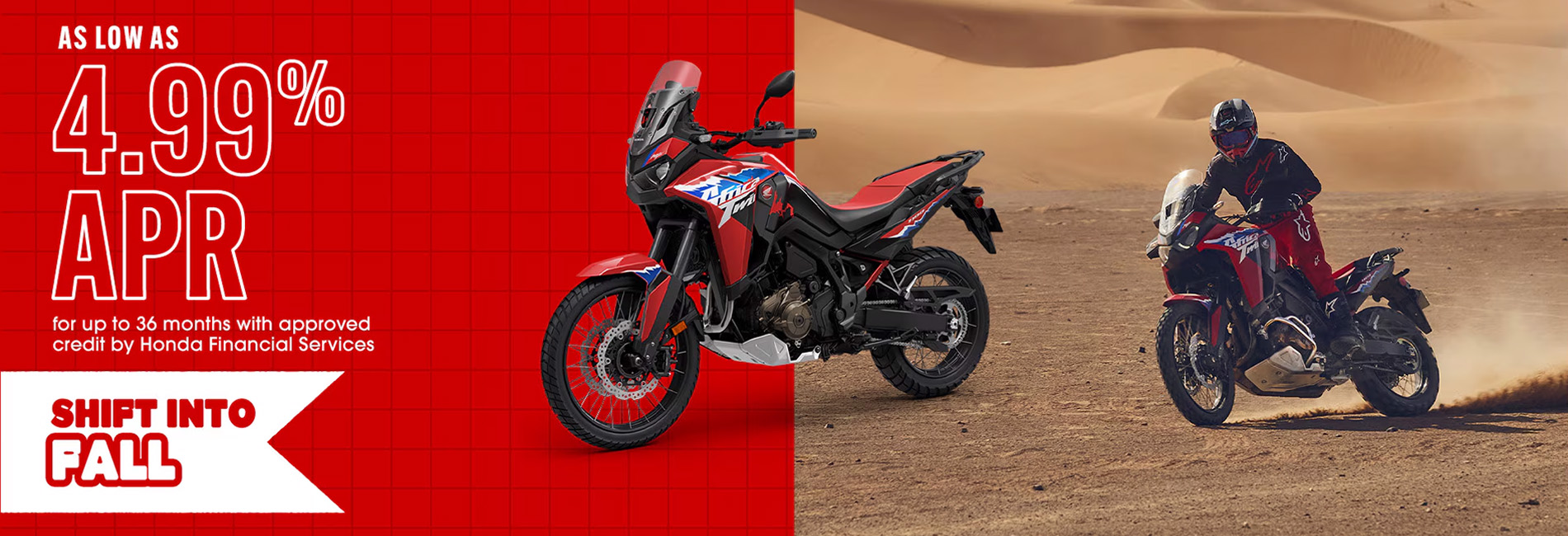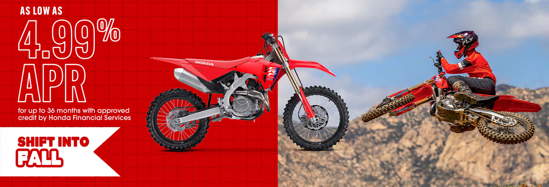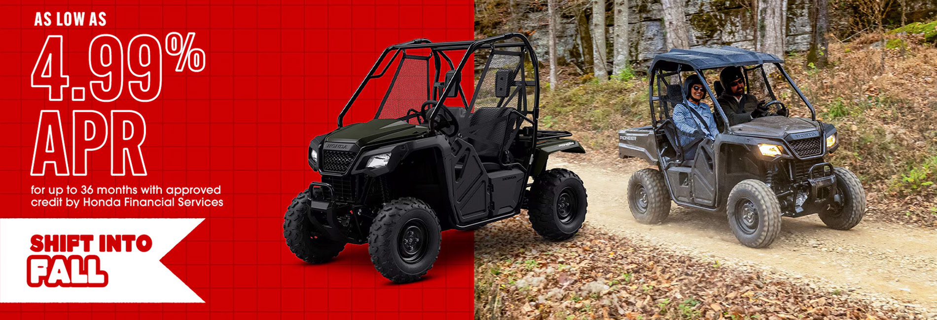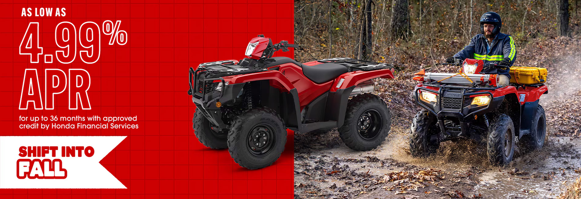 4.99% fixed APR financing for 24 -36 months, available to well-qualified customers, not all customers will qualify. Example for new Honda ATV’s: 4.99% APR for 36 months financing at $29.97 a month for every $1,000 financed with 10% downpayment. 5.99% APR for 48 months financing at $23.48 a month for every $1,000 financed with 10% downpayment. 6.99% APR for 60 months financing at $19.80 a month for every $1,000 financed with 10% downpayment. Offer available for any new and unregistered Honda ATV’s, with a minimum amount financed of $1,000 and a minimum monthly payment of $75. Check with participating dealers for complete details. Dealers set actual sales prices. Higher rates apply for different terms and/or buyers with lower credit rating. Offer valid through 6/30/2025, on approved credit by Honda Financial Services through participating dealers.