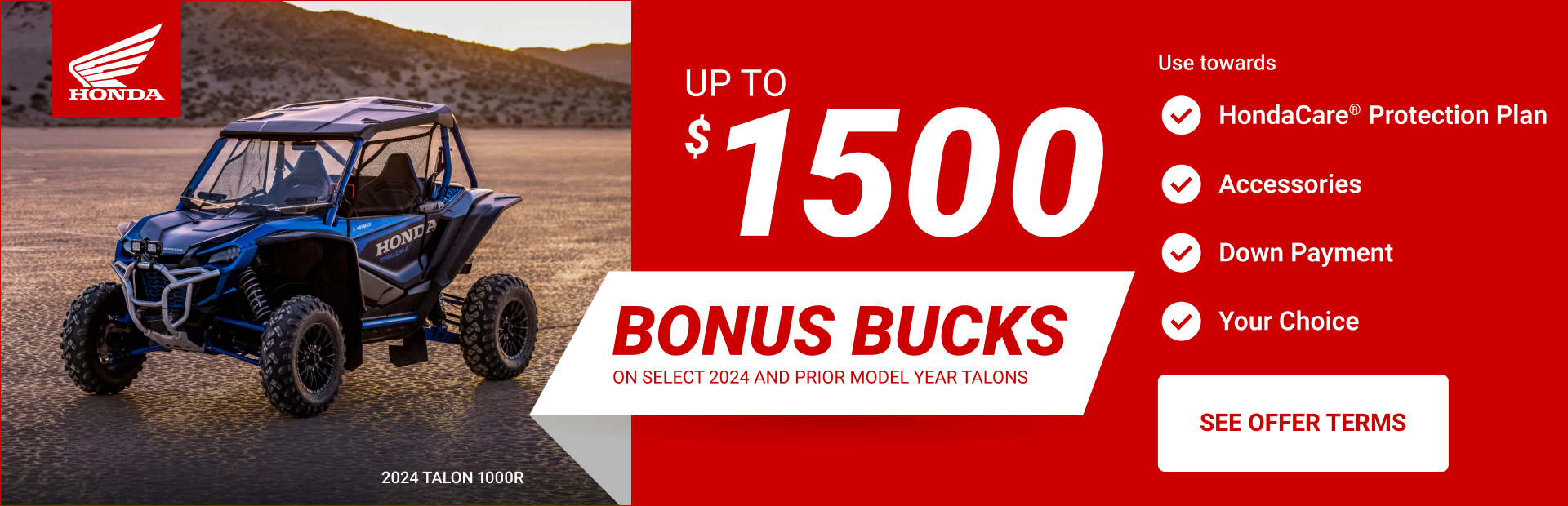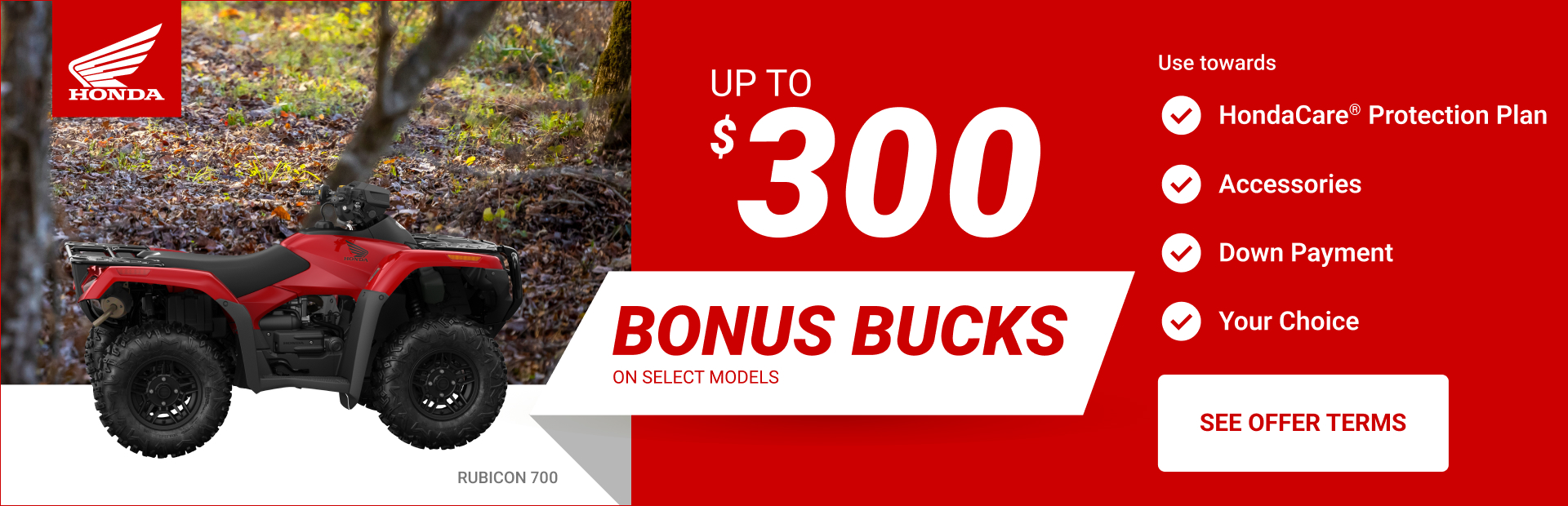 $400.00 in Honda Bonus Bucks rebate offer is valid with the purchase of new and unregistered 2024 and prior FourTrax Rubicon 4x4 Automatic models. Bonus Bucks rebate can be redeemed on date of purchase towards purchase of new and unregistered vehicle. Offer is not transferable. Check with participating Honda Dealers for complete details. Offer valid through June 30, 2025. Applicable taxes, shipping/handling fees may not be redeemed as part of this promotion.